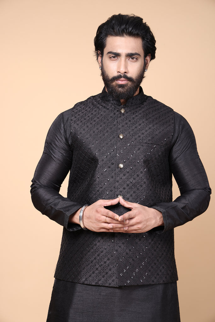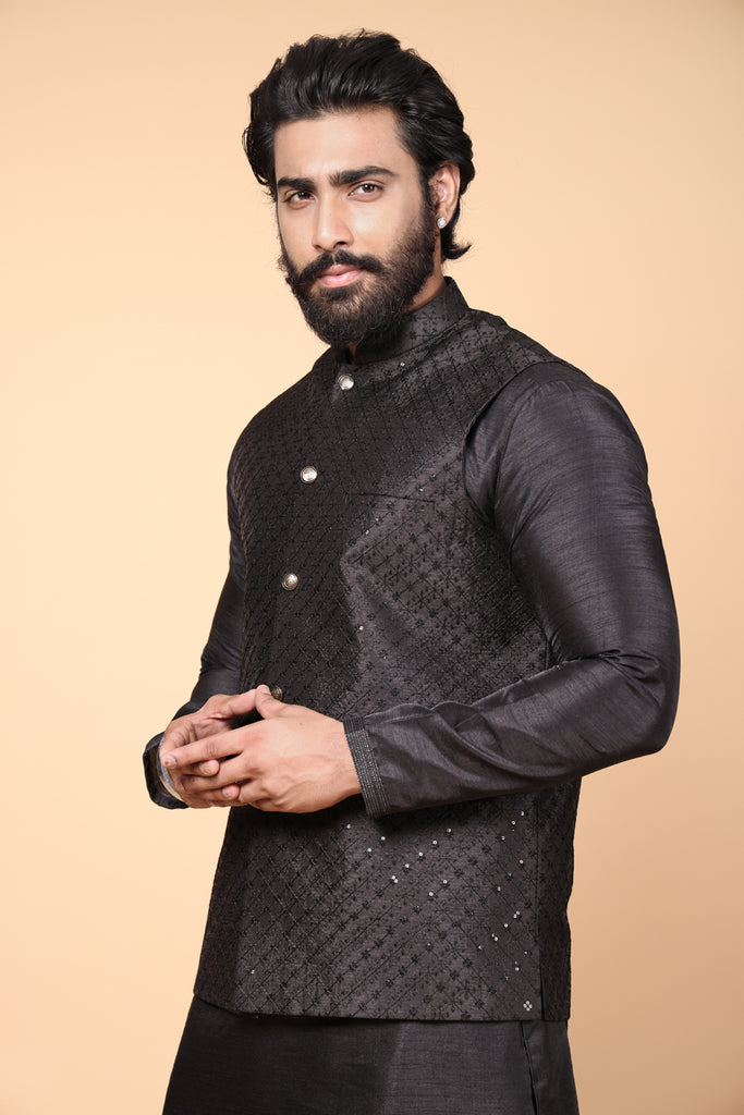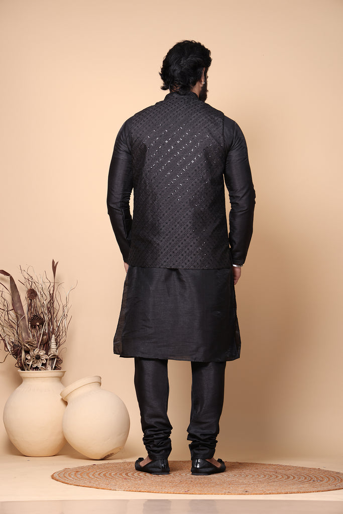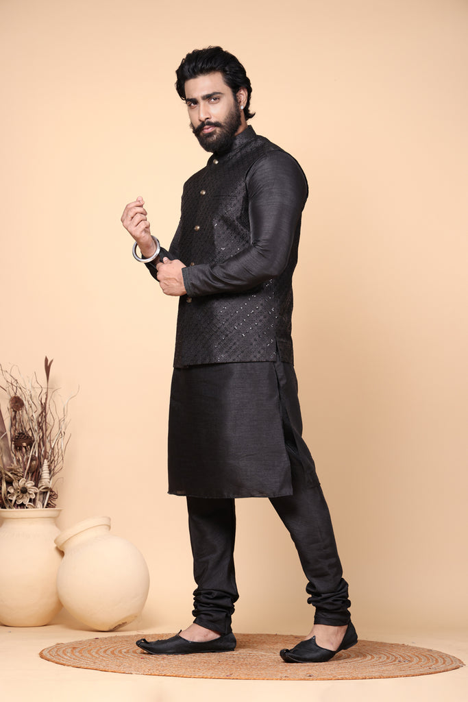 Full Set Includes: 1 Black Kurta, 1 Black Pyjama, and 1 Jacket