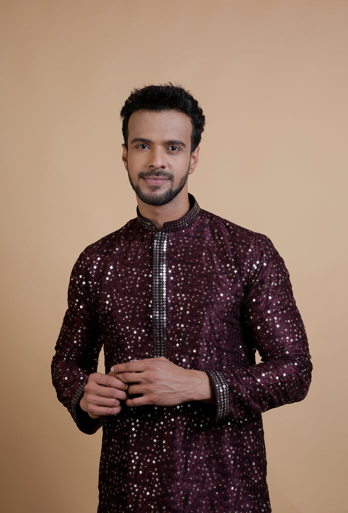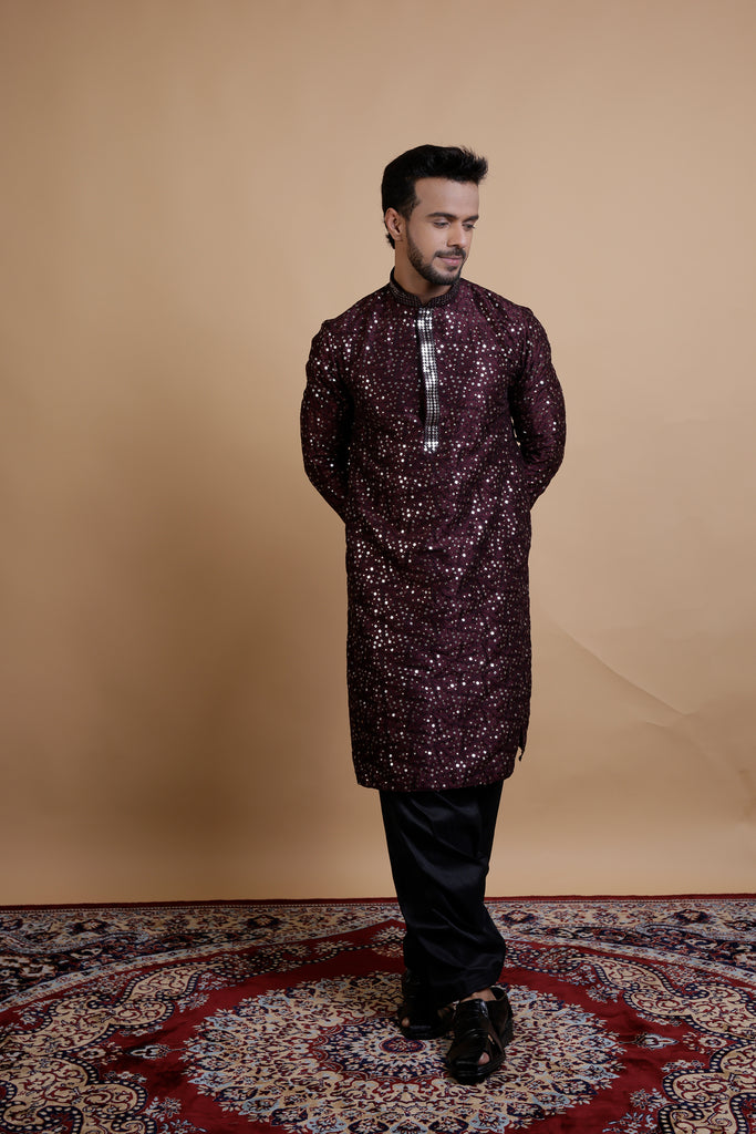 - Fabric: Cotton and Silk Blend | Pattern: Sequin Embroidery | Closure: Buttoned | Length: Knee Length