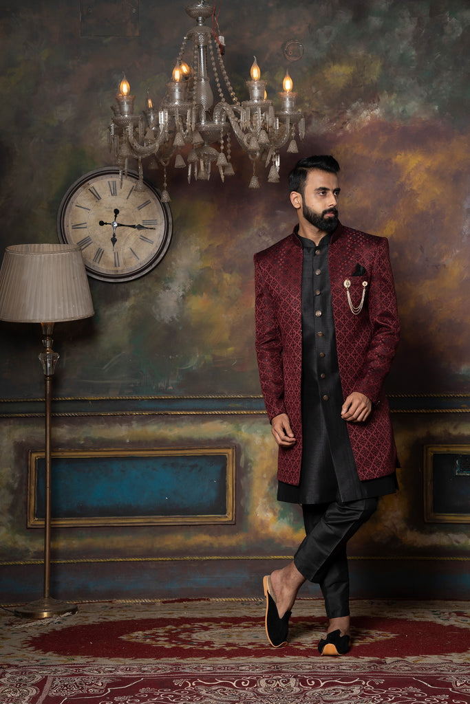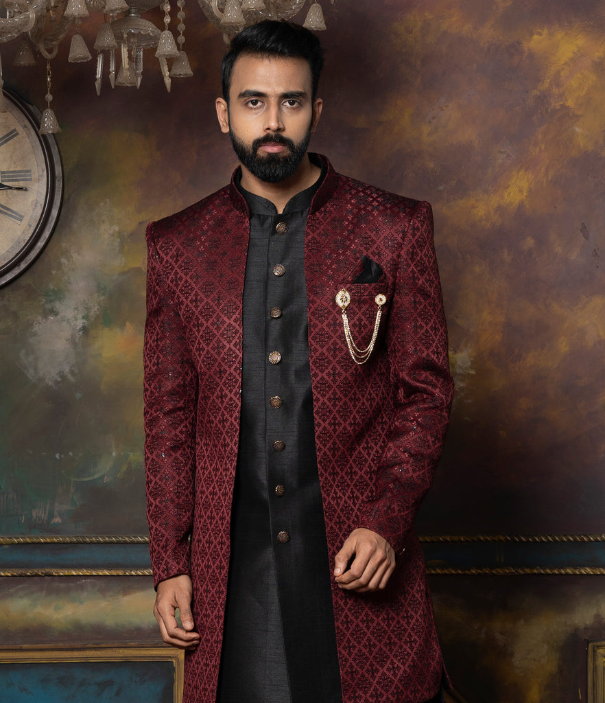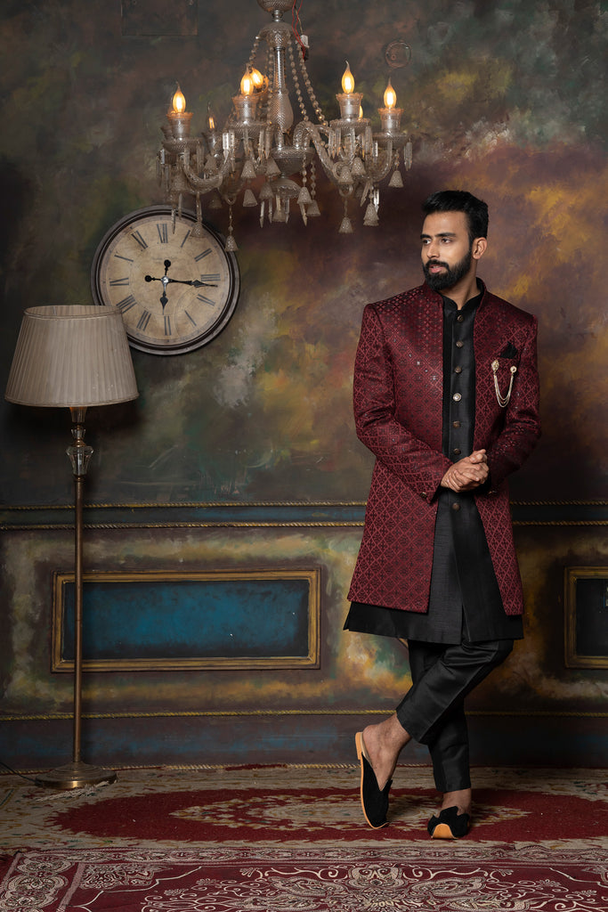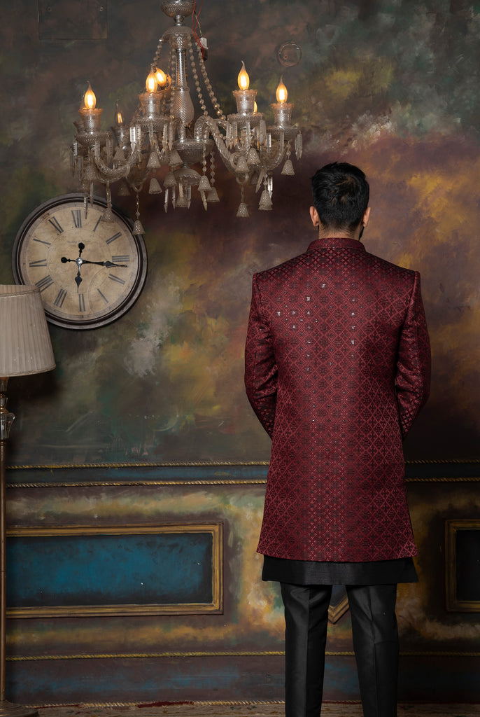 Red Silk Brocade Patterned Indo-Western